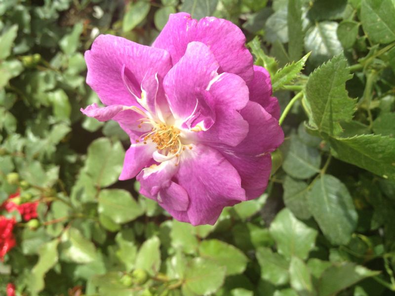 Blomsten er purpurviolet, senere gråblå, mellemstor og halvfyldt.